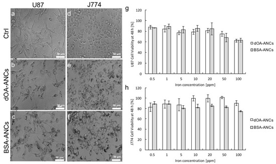 In vitro cell viability with ANCs. Cell internalization and viability studies were conducted on U87-MG glioblastoma multiforme cells and J774 murine macrophages. Bright field images of U87-MG cells incubated with (a) no ANCs (ctrl); (b) 20 ppm double oleic acid layer (dOA)-coated ANCs (dOA-ANCs); and (c) 20 ppm bovine serum albumin-coated ANCs (BSA-ANCs). Bright field images of J774 macrophages incubated with (d) no ANCs (ctrl); (e) 20 ppm dOA-ANCs; and (f) 20 ppm BSA-ANCs; Cell viability tests on (g) U87-MG cells and (h) J774 macrophages incubated with differently coated ANCs for up to 48 h.