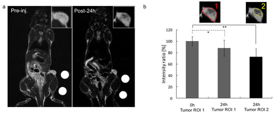 Similar experiments were performed to characterize the in vivo MRI performance of the BSA-ANCs. A 3T clinical scanner (Philips Ingenia) equipped with a mouse coil was used for these characterizations after tail vein injection of 5 mgFe·kg‒1 animal (n = 3). Note that no external magnet was used in this case. Figure 5a shows T2-weighted MR images of one representative mouse bearing U87-MG cells in the flank, before ANC injection (left) and at 24 h p.i. (right). In a comparison of the two insets (top, right), the malignant mass appears darker (signal attenuation) at the latest time point, demonstrating the accumulation of T2 contrast-enhancing agents. Figure 5b quantifies the change in contrast in two different regions of interest (ROIs), as depicted in the insets. The signal attenuation was significant for both ROIs at 24 h p.i. The NIRF and MR images in Figure 4 and Figure 5, respectively, demonstrate the tumor accumulation of BSA-ANCs within 24 h post-injection.