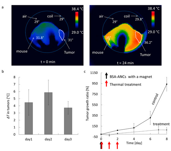 The therapeutic activity of BSA-ANCs was assessed in mouse models (n = 3) of glioblastoma multiforme. First, 5 mgFe·kg‒1 were injected via a tail vein, and a magnet was applied to the tumor area for 40 min p.i. to enhance tumor accumulation. Figure 6a shows infrared images of a representative mouse, lying within the coils of the AMF generator, before (left) and at 30 min after initiation (right) of the treatment. Before starting the experiment, the coils looked dark, and the overall mouse body temperature was ~31 °C, whereas the tumor mass on the right side appeared at a slightly lower temperature of ~28 °C. Upon activation of the AMF generator (field strength: 10 kA·m‒1, frequency: 512 kHz), the tumor temperature increased by ~5 °C within 30 min, as shown in Figure 6b, for each consecutive treatment. Please note that infrared thermometry is a surface measurement; a further increment of about 3 °C is expected to be achieved inside the tumor. Moreover, as compared with this heating effect with/without ANCs, it was clear that this change was caused only by ANCs with AMF (Supplementary Figure S9). With this increased temperature, changes in enzymatic activities can affect cell structures and cell growth or differentiation, inducing cell apoptosis and/or necrosis [30]. The AMF exposure of the malignant mass for 30 min for three consecutive days post BSA-ANC injection was sufficient to dramatically reduce the tumor growth ratio. This is shown in Figure 6c, demonstrating a significant difference in tumor growth between the treated mice and the untreated control animals. Notably, the untreated mice experienced an almost 10-fold increase in tumor size over eight days, whereas the animals injected with BSA-ANCs and exposed to AMF had only a moderate 0.5-fold increase in tumor mass within the same time period.