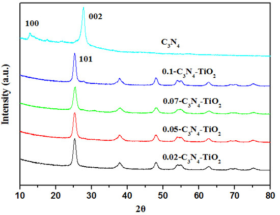 Figure 2 shows the X-ray diffraction patterns of X-C3N4-TiO2 and g-C3N4. The pattern of the g-C3N4 sample has two peaks. The small-angle peak (100) at 12.77 indicates the in-plane structural packing motif. The strongest peak at 27.62 is the characteristic interlayer stacking peak of the aromatic system, indexed as the (002) peak for graphitic materials [20]. The diffraction peaks of TiO2 exhibit the typical structure of anatase phase. When g-C3N4 is combined with TiO2, all hybrids of g-C3N4-TiO2 show the typical anatase TiO2 phase [17]. The characteristic peaks of g-C3N4 are not observed due to the low content in hybrids and relatively weak diffraction intensity of g-C3N4.