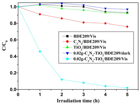Temporal curves of the degradation of BDE209 under different conditions. BDE209: 1.0 × 10−5 mol/L; 0.02-g-C3N4-TiO2: 1 mg/mL; solvent: CH3OH; wavelength >420 nm; anoxic condition.