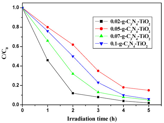 Temporal curves of the photodegradation of BDE209 with x-g-C3N4-TiO2 (x = 0.02 to 0.1) under visible irradiation. BDE209: 1.0 × 10−5 mol/L; g-C3N4-TiO2: 1 mg/mL; solvent: CH3OH; wavelength >420 nm; anoxic condition.