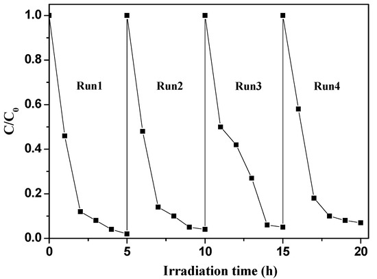 Cycling runs in the degradation of BDE209 with 0.02-g-C3N4-TiO2 under visible irradiation. BDE209: 1.0 × 10−5 mol/L; 0.02-g-C3N4-TiO2: 1 mg/mL; solvent: CH3OH; wavelength >420 nm; anoxic condition.