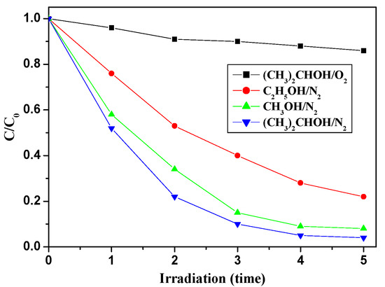 Effect of hole trapping agent on the photoreductive degradation of BDE209 by g-C3N4-TiO2 under visible light irradiation. BDE209: 1.0 × 10−5 mol/L; 0.02-g-C3N4-TiO2: 1 mg/1 mL; wavelength >420 nm; solvent: CH3CN; trapping agents: isopropanol, methanol, ethanol 0.1 mL.