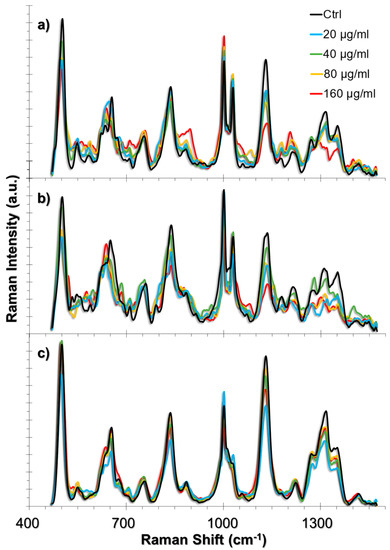 SERS spectra obtained from (a) HUVEC, (b) A549, and (c) L929 cell lines upon 24 h exposure to TiO2 NPs. The spectra obtained from increasing concentrations of TiO2 NPs were overlapped with their respective non-incubated controls.