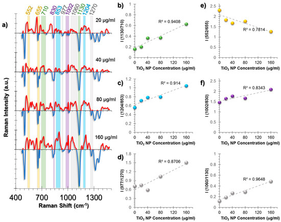 (a) The spectra obtained from non-incubated control cells were subtracted from the TiO2 NP-incubated cells to provide an easier tracking of spectral changes. The positive values corresponding to a spectral intensity increase were colored red, whereas the negative values were colored blue. Another color code was used to visualize the intensity ratio combinations. The peaks with the same highlight color were compared as an intensity ratio. The intensity ratios obtained from the SERS spectra of A549 cell line at increasing concentrations of exposure to TiO2 NPs for 24 h. The ratios represent (b) Triglyceride deposition, (c) Fatty acid biosynthesis increase, (d) Cholesterol/phospholipid trans-gauche membrane changes, (e) Phe/Tyr inflammation marker, (f) GSH/GSSG antioxidant activity. The coefficient of determination (R2) was given for each graph next to their trendlines.