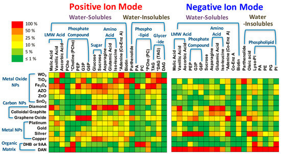 The nanomaterials selected as matrix for LDI in the analysis of small molecules is often a key matter of trial and error. Recently, a number of nanomaterials have been utilized in nanomaterial-assisted LDI. As a typical example, a large scale screening of 13 nanoparticles (NPs), including metal oxide NPs (WO3, TiO2, Fe3O4, AZO (aluminum-doped zinc oxide), ZnO, SnO2), carbon-based NPs (boron doped nanodiamond, colloidal graphite, graphene oxide), and metal NPs (Pt, Au, Ag, Cu), the analysis of two dozen small metabolite molecules was reported by Yagnik et al. [27]. The heat map demonstrated that a large number of NPs showed much higher LDI efficiency than that of traditional organic compounds in positive mode and some NPs showed comparable efficiencies in negative ion mode (e.g., Ag for olefins, Ag and Au for sulfur compounds) (Figure 1). The obtained results indicated that metal oxide and diamond NPs exhibited high LDI efficiency in the positive ion mode, resulting from the good laser absorption efficiency at 355 nm and low thermal conductivity. This whole process is thermally driven, largely independent on the analytes because cationization process begins to occur after gasification of analytes, showing high specificity. Moreover, other NPs showed good specificity both in the positive and negative ion modes, due to the specific affinity of the analytes on the NPs. Therefore, besides chemical interaction, thermal driven desorption plays a significant role in nanomaterial-assisted LDI using the metal oxides NPs.
