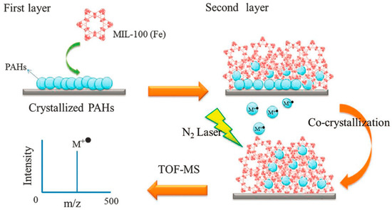Metal organic frameworks (MOFs) are a new type of hybrid crystalline nanomaterials that are constructed from clusters of metal ions and organic ligands [74]. Because of their unique properties including large surface area, high porosity, and tunable pore sizes, MOFs have been utilized in gas storage, separation, catalysis, magnetism, and adsorption. Moreover, MOFs could provide high absorption efficiency in the UV-visible range, which meets the requirement of matrix for LDI. As a result, MOFs as a matrix for LDI-TOF MS for the analysis of small molecules was first introduced by Huang’s group in 2013 [75]. In this work, several porous MOFs (MIL-100 (Fe), MIL-100 (Cr), MIL-100 (Al), MIL-101 (Cr), DUT-4 (Al), DUT-5 (Al) and CYCU-3 (Al)) were synthesized and used as matrices for LDI-MS (Figure 2). The properties of above MOFs were evaluated as matrices by using five PAHs (anthracene, pyrene, benzo[α]anthracene (BaA), chrysene, benzo[α]pyrene (BaP) as test analytes. Results showed that free background interference obtained from cage-type MOFs MIL-100 and MIL-101 (Cr) and very low background interference from tunnel-type MOFs (DUT-4 (Al), DUT-5 (Al) and CYCU-3 (Al)). The influence of different metal ion connectors on the performance including MIL-100 (Fe), MIL-100 (Cr), MIL-100 (Al), MIL-101 (Cr) as matrix were investigated and the results revealed each MIL-100 could provide the absence of background signals. However, the different metal types influenced the PAHs intensity and signal reproducibility. Cage-type 3D MIL-100 (Fe) provided the best shot-to-shot reproducibility. This nanomaterial was reported to serve as matrix for LDI-MS for the detection of biomolecules by the same group [76].