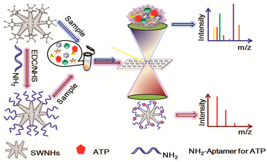 Utilizing the above nanomaterials as the matrix, a variety of small molecules (<700 Da) can be analyzed in the nanomaterial-assisted LDI-MS with free background interference, including small biological molecules, environmental pollutants and other small molecules. Small biological molecules are a type of low-molecular weight (<700 Da) organic compounds that may assist to regulate a biological process. Various nanomaterials have been synthesized and applied in nanomaterial-assisted LDI for analysis of the biological molecules. For instance, Ma et al. [81] prepared single-walled carbon nanohorns (SWNHs) and used as the matrix for LDI-TOF MS for the analysis of various biomolecules including amino acids, peptides and fatty acids. To further improve the selectivity and sensitivity, aptamers-modified SMNHs (Apt-SWNHs) was synthesized by carboxylic groups conjugated with adenosine triphosphate (ATP) aptamers via forming the amide between the –COOH group on the SWNHs and the –NH2 moiety of the aptamer. The as-prepared functional materials could act as both an affinity extraction and detection platform for simultaneous capture, enrichment and ionization of ATP from complex biological samples (Figure 3). The LOD of the developed Apt-SWNHs based method was greatly improved (1.0 µM) for the analysis of ATP in complex biological media. Calandra et al. [82] utilized carbon nanohorns as a matrix for LDI-TOF MS detection of irinotecan, sunitinib and 6-α-hydroxy-paclitaxel.