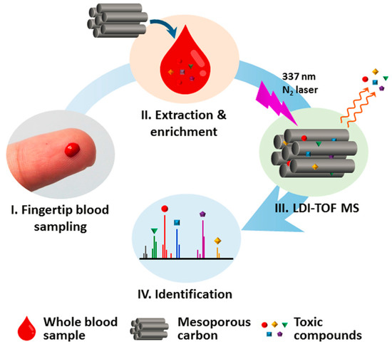 - Huang, X.; Liu, Q.; Fu, J.; Nie, Z.; Gao, K.; Jiang, G. Screening of toxic chemicals in a single drop of human whole blood using ordered mesoporous carbon as a mass spectrometry probe. Anal. Chem. 2016, 88, 4107–4113. [Google Scholar] [CrossRef] [PubMed]