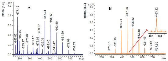 Matrix assisted laser desorption/ionization (MALDI) time-of-flight mass spectrometry (TOF MS) spectra of a low molecular weight polypropylene glycol (PPG) (ca. 425 Da) obtained from analyses by (A) MALDI with 2,5-dihydroxybenzoic acid (DHB) as a matrix and (B) laser desorption/ionization (LDI) on the layer of graphene nanoparticles (GN). Reproduced with permission of [121].