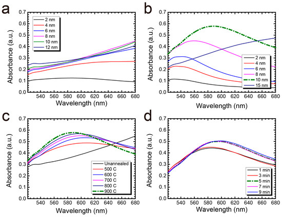 Change in absorbance spectrum under different annealing conditions: (a) Gold thin film thickness varying from 2 to 15 nm (a) without and (b) with RTA treatment; (c) 10 nm gold thin film with the maximum RTA temperature varying from 500 to 900 °C for 5 min; (d) 10 nm gold thin film under 900 °C RTA treatment with 1 to 9 min annealing time. Dashed line represents the optimal fabrication condition.