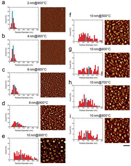 AFM images and histograms of RTA-treated Au nanostructures diameter distribution at (a–e) 2–10 nm deposition thickness with 900 °C RTA for 5 min and (f–i) 10 nm deposition thickness with 500–900 °C RTA for 5 min. Blue color bar represents the mean diameter of the gold nanoparticle. Scale bar is 500 nm.