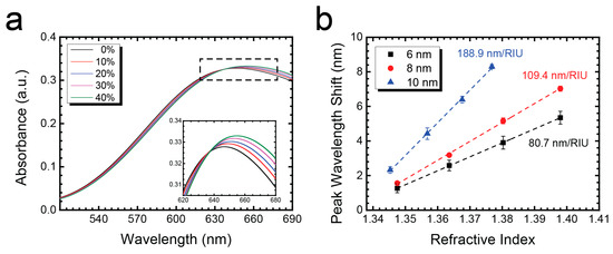 Sensitivity test of RTA-treated Au nanostructures. (a) Absorbance spectra of 0–40% glucose solution in DI water; (b) Sensitivity of 10 nm annealed Au nanostructures is 188.9 nm RIU−1 (n = 5).