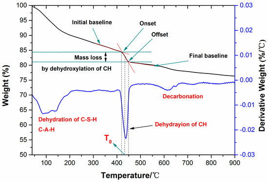 Thermal gravimetric analysis (TGA/DSC, NETZSCH, ATA409, NETZSCH, Selb, Upper Franconia, Germany) has been widely used to identify hydration products, including ettringite, monosulphate (AFm), and calcium hydroxide (CH), and has been accepted as an accurate method for the determination of crystalline calcium hydroxide content [43,44]. The samples for thermal gravimetric analysis were prepared in a similar method to the samples used for XRD analysis. TG-DTG analysis was conducted using a simultaneous thermal analyzer with a uniform heating rate of 10 °C per minute from 40 to 1000 °C under nitrogen flow. The weight loss of the samples was calculated and the reactions occurring with an increase of temperature in the samples are discussed in References [45,46]. The calcium hydroxide content was determined using the method described by a graphical technique used previously in References [43,44] and is illustrated in Figure 3.