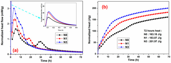As Figure 4 illustrates, the addition of nano-SiO2 did not remove or add additional peaks, but changed the intensities or time they occurred. When compared with the reference sample, the main peak occurred earlier as the nano-SiO2 dosage increased, indicating that nano-SiO2 increased the hydration rate of C3S. Obviously, the formation of AFm could have been obtained at an earlier stage when nano-SiO2 was added to the paste, and a possible reason was examined in Reference [50]. The addition of nano-SiO2 powders significantly increased the intensity of the heat peak and shortened its duration of occurrence. The increase in nano-SiO2 dosage from 1% to 3% enhanced these effects, but did not trigger a proportional increase in the heat release rate. Figure 4 shows the curves of the total heat evolution during the first 72 h of hydration. This corresponds to the trend of heat evolution rate as the incorporation of the nano-SiO2 powders resulted in a greater cumulative heat release. Such a great heat release was mainly due to the presence of nano-SiO2 accelerating the reaction process in the cement based system. Said [21] suggested that the acceleration effect of nano-SiO2 on the hydration of cement-based materials was related to its considerably fine particle size with high surface area, which could act as potential heterogeneous nucleation sites for the hydration products to deposit, thus increasing the hydration rate and decreasing the induction period. Moreover, nano-SiO2 exhibited ideal pozzolanic activity owing to its amorphous nature [19,20], which led to the formation of additional C–S–H. The additional C–S–H acted as additional nucleation sites [9], promoting the formation and growth of reaction products from the dissolved units. Consequently, the reaction process was accelerated.