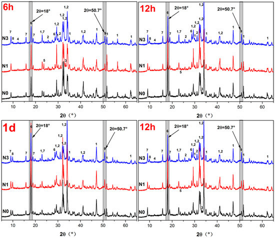 As nano-SiO2 was observed to have a significant acceleration effect on the hydration kinetics of AC$A cement (as illustrated in Figure 5), the effect on phase development was further investigated through detailed XRD studies. Each peak shift and intensity was monitored and carefully analyzed. For comparison, the peaks of CH (2θ = 18°) and crystalline C–S–H (2θ = 50.7°, jennite and tobermorite) [51] were first selected (see grey area in Figure 5). In Figure 5, a peak in CH was observed in the N0 mix representing the hydration product (CH), which was released during the hydration of the AC$A cement. At 6 h, the intensity of the CH peak evidently increased with the addition of nano-SiO2, especially at 1% content, which reflected the accelerated cement hydration reaction by nano-SiO2 during this period. However, the intensity of the CH peak decreased with the addition of nano-SiO2, and was significantly reduced with nano-SiO2 when time was increased from 12 h to 3 days, which can be mainly attributed to the high pozzolanic reactivity of the nano-SiO2 consuming the CH in the paste at a later stage. In contrast, during all time periods, the intensity of the C–S–H peak remarkably increased in each mix when compared to the control mix. This was due to the nucleating effect of nano-SiO2, which accelerated the growth of the hydrated products and the pozzolanic effect with CH which formed an additional C–S–H as per Equations (3)–(5) [51]. In the pastes with added nano-SiO2, AFm formed at the very early stages of hydration (within 6 h), and its intensity increased with nano-SiO2, whereas there was no AFm present in the control specimen. These results cohere well with the results of hydration heat in Section 3.1.