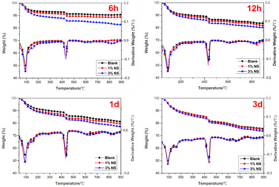 The results of the TG/DTG analysis for the samples containing nano-SiO2 hydrated for different curing ages are illustrated in Figure 6; curves are represented as functions of furnace temperature. The trend of mass loss was similar, but the differences are rather visible among these TG curves. It can be clearly seen that the overall mass loss of the samples changed with the amount of nano-SiO2 and curing time (see Table 4). It was observed that the weight loss of the control paste increased from 9.18% to 25.51% with an increase from 6 h to 3 days. As for the paste with the 1% nano-SiO2 addition, the weight loss increased from 11.06% to 26.18% with the testing period from 6 h to 3 days. When comparing the weight loss of all paste samples at 3 days, the 3% NS addition shows the highest value, which is 27.36%. The overall mass loss can be used to explain the acceleration effect of nano-SiO2 directly on AC$A cement hydration.
