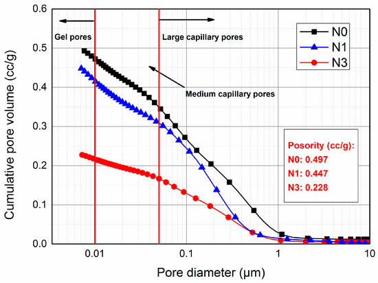 MIP has been widely used in the quantitative characterization of pore structure in cement-based materials where a wide range of pore sizes from 0.001 μm to 1000 μm can be measured [54,55]. Therefore, both the porosity and the pore size distribution of cement paste can be obtained through this technique. According to previous research [12], the pores in hydrated cement paste are classified into three parts: 10–0.05 μm, 0.05–0.01 μm and <0.01 μm, which represents large capillary pores, medium capillary pores and gel pores, respectively.