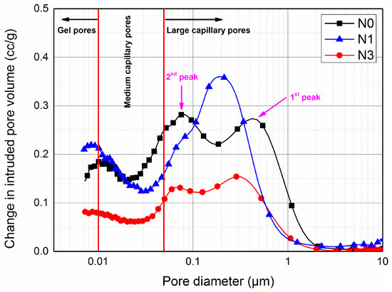 The pore size distribution (the variation of dV/d log V with pore diameter) of blended AC$A cement pastes are plotted in Figure 8. The region under the curve represents the concentration of the pores and the value of the critical diameter corresponded to the peak value of the log differential curve from the MIP results [12]. Based on the curves, it was clear that the addition of nano-SiO2 had a significant effect on the pore size distribution. The first peak value (maximum concentration of pores) in N0 was 0.45 μm, whereas the peak values shifted to smaller regions in N1 and N3, corresponding to 0.2 μm and 0.31 μm, respectively. However, the difference among all three samples was not obvious in terms of the second and third peak values. As seen in Table 5, with 1% nano-SiO2 addition, capillary pores (including large and medium capillary pores) with a diameter between 0.01 and 10 μm became smaller than the control sample, while the gel pores became larger. However, for the 3% nano-SiO2 addition, the volume of both capillary and gel pores decreased significantly at 53.90% and 51.81% less than N0, respectively. These results were also consistent with the curves shown in Figure 8.