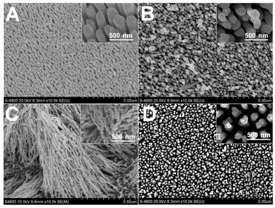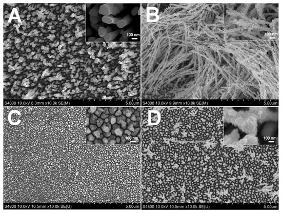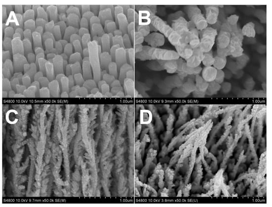 SEM images of Rh nanowires electrodeposited at different potentials in aqueous solution containing 1.6 mM RhCl3, 16 mM sodium citrate and 0.1 M HClO4. The constant growth potential: (A) −0.20 V; (B) −0.25 V; (C) −0.30 V; (D) −0.50 V.