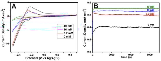 The morphology dependence of Rh nanowires from the citrate concentration was also closely related to the reduction rate of Rh ions. The Reduction rate of ions or the generation rate of atoms affects the morphology of Rh nanowires. Cyclic voltammetry (Figure 2A) and chronoamperometry (Figure 2B) were conducted to observe how citrate concentrations affect the reduction of Rh ions. The current level at −0.5 V decreased when increasing the citrate concentrations from 0 to 40 mM (Figure 2A). This indicates that the presence of citrate makes the Rh(III) ions reduction more difficult. At a given electrode potential and a high citrate concentration, more negative ionic Rh complexes were formed, which led to the decrease of the reduction rate (or the current density) (Figure 2B). At a low reduction rate, Rh atoms can have a sufficient time to choose energy-preferred sites to grow and not irregularly accumulate. At a low current density (green trace in Figure 2B) the formation of smooth Rh nanowire is facilitated as shown in Figure 1A. At high current density (blue curve in Figure 2B) well-formed coarse and thin Rh nanowires are obtained. At higher current density (red and black curves in Figure 2B) Rh nanowires deposition was unsuccessful. Since citrate coordination with Rh ions shifts the electrode potential to lower values, at a constant electrodeposition potential relative to reference electrode (Ag/AgCl) the current density is different from each control electrolyte. In order to keep an equivalent actual electrode potential for each citrate-containing electrolyte, we operated the electrodeposition in constant overpotential conditions (OCP). As a result, Rh nanowires deposited from different concentrations of citrate in electrolyte had a similarly smooth morphology.