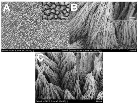SEM images of Rh nanowires electrodeposited at −0.30 V for 2 C using a solution containing 0.1 M HClO4, 16 mM sodium citrate and different concentration of RhCl3. (A) 0.8 mM; (B) 1.6 mM; (C) 3.2 mM.