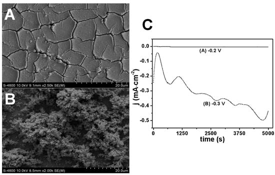 The coarse morphology of Rh nanowires was correlated to the electrolyte composition, the Rh(III) concentration and the electrodeposition potential. AAO nanopores played the role of a nanoscale container, which is not responsible for the formation of coarse or smooth morphologies. This was verified by electrodepositing Rh nanostructures on a planar glassy carbon electrode without the assistance of the AAO template (Figure 5). Figure 5A shows a relatively smooth surface at −0.2 V, while Figure 5B shows a porous bush-like Rh deposit at −0.3 V. This suggests that the morphology of Rh nanowires is strongly affected by electrodeposition condition, but not the presence of the AAO template. Apparently, coarse Rh deposits have a higher surface area, which contributes to the enhanced current level observed during the electrodeposition as shown in Figure 5C (dashed line). The current difference was also partially due to the potential difference. The high current led to a strong hydrogen evolution, and hydrogen bubbles influenced the stability of the current level, resulting in the wrinkled current curve in Figure 5C.