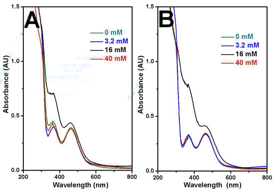 Since pH is one of the most important parameters for an electrolyte, pH influence on the morphology of Rh nanowires was further investigated based on the optimal electrode potential and concentration of electrolytes established from above experiments. Addition of trisodium citrate into electrolytes caused increases in pH values. pH reached 1.12, 1.15, 1.37, 3.05 when 0, 3.2, 16, 40 mM trisodium citrate were in the electrolyte of 0.1 M HClO4 and 1.6 mM RhCl3. The morphologies of electrodeposited Rh nanowires were obtained, as shown in Figure 6, using constant pH 1.37 that was adjusted by adding NaOH or HClO4. At constant pH, only 16 mM citrate in the electrolyte could produce coarser Rh nanowires with attenuated diameter and many branches (Figure 6). This experimental set suggested that the concentration of trisodium citrate, pH of electrolyte and electrode potential of electrodeposition strongly correlate with the formation of coarse Rh nanowires. pH did influence the coordination between Rh(III) and ligands. Ultraviolet-visible (UV-Vis) spectrophotometry further evidenced that 16 mM citrate containing electrolyte is special and feasible to give a distinct morphology of Rh nanowires (Figure 7). The absorbance at 361 nm and 462 nm originates from d-d transition in RhCl3 compound. Without keeping pH constant, 16 mM citrate in the electrolyte gave rise to the strongest absorbance at 361 nm (black trace, Figure 7A). This unexpected result was probably caused by the formation of Rh(III)-citrate-Cl co-complex at the specific pH 1.37, which induced the strongest absorption of photons of light. Only a small absorbance difference was observed among other three electrolytes, but these absorbances significantly differ from what 16 mM citrate electrolyte gave. At a constant pH 1.37, the similar result was obtained as shown in Figure 7B. 16 mM citrate containing electrolyte still gave the strongest absorbance and other three control electrolytes showed tiny difference in absorbance. Conclusively, the combination of proper concentration of RhCl3, trisodium citrate, perchloric acid in the electrolyte, and proper pH, and proper electrode potential can synergistically produce coarse Rh nanowires utilizing AAO template-assisted electrodeposition.