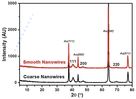 X-ray diffraction (XRD) patterns from smooth and coarse Rh nanowires were acquired to investigate their crystallinity (Figure 8). Four characteristic diffraction peaks from the metallic Au (2θ = 38.2°, 44.4°, 64.6° and 77.5°) were observed, corresponding to the Au (111), (200), (220), and (311) facets (JCPDS, No. 01-089-3697), respectively. In Figure 8, diffraction peaks at 2θ = 41.1°, 47.8°, 69.9° were ascribed to the Rh (111), (200) and (220) facets of the FCC Rh (JCPDS, No. 05-0685), respectively. Moreover, no other impurity peaks were detected, indicating the high phase purity of the deposit. Smooth and coarse Rh nanowires showed similar XRD patterns, indicating that the specific crystal facets couldn’t be screened in such electrodeposition condition. This is a difference from many metal nanoparticle synthesis methods where the citrate surfactant controls the nanoparticle shape.