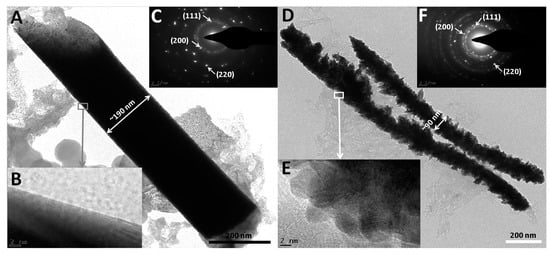TEM images (A,D); high-resolution TEM images (B,E) and selected area electron diffraction (SAED) (C,F) for smooth Rh and coarse Rh nanowires, respectively.