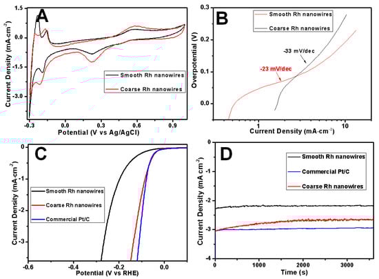 Cyclic voltammograms (CV) curves (A); Tafel curves (B); linear scanning voltammetry (LSV) curves (C,D) durability test of smooth (black) and coarse (red) Rh nanowires. The scanning was recorded at 2 mV·s−1 in 0.1 M H2SO4. Surface areas of the catalysts have been normalized.