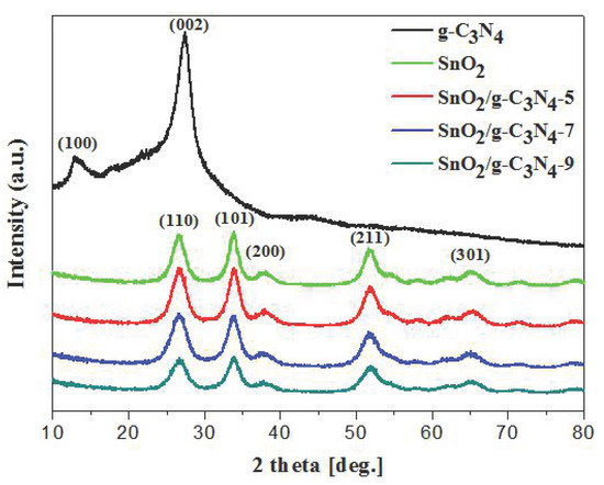 XRD patterns of the g-C3N4, SnO2, SnO2/g-C3N4-5, SnO2/g-C3N4-7, and SnO2/g-C3N4-9 composites.