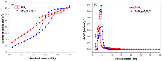 (a) N2 adsorption-desorption isotherms and (b) the corresponding pore size distribution curves of the SnO2 and SnO2/g-C3N4-7 composite.