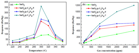 (a) Response values of the sensors based on SnO2, SnO2/g-C3N4-5, SnO2/g-C3N4-7, and SnO2/g-C3N4-9 to 500 ppm ethanol as a function of the operating temperature; (b) the responses of sensors (SnO2, SnO2/g-C3N4-5, SnO2/g-C3N4-7, and SnO2/g-C3N4-9) operated at 300 °C versus different concentrations of ethanol.