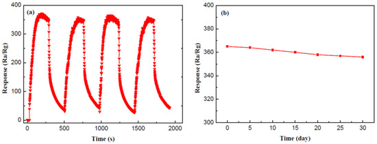The repeatability and stability are both crucial criteria to measure the gas-sensing properties. Figure 8a reveals the repeatability of the SnO2/g-C3N4-7 sensor to 500 ppm ethanol at 300 °C. As shown by the curves, the response values of the four response-recovery cycles are almost maintained at about 360. It can be concluded that the composite sensor has an admirable repeatability for ethanol gas sensing. A durable response value was measured to explore the stability of the SnO2/g-C3N4-7 sensor. Figure 8b displays the test result every five days, and the response values to 500 ppm ethanol at 300 °C are maintained at around 360. Therefore, we may safely draw the conclusion that the SnO2/g-C3N4-7-based sensor has an unexceptionable stability for ethanol gas sensing.