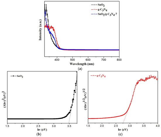 As displayed in Figure 10a, the absorption edge of SnO2, SnO2/g-C3N4-7 and g-C3N4 are around 377 nm, 441 nm, and 455 nm, respectively. This result can be ascribed to the heterojunction structure between SnO2 and g-C3N4. The band gap energies of SnO2 and g-C3N4 can be estimated according to the equation (Ahν = k(hν-Eg)n/2). In this equation, n is determined by the type of optical transition of a semiconductor. The value for g-C3N4 and SnO2 is 4 and 1, respectively. A, ν, Eg, k and h are the absorption coefficient, light frequency, Planck constant, band gap and a constant, respectively. The diagrams are shown in Figure 10b,c. The Eg of SnO2/g-C3N4-7 should be roughly calculated according to the equation (Eg = 1240/λ) because of the uncertain type of optical transition. As a result, the Eg of SnO2, g-C3N4, and SnO2/g-C3N4-7 are 3.49 eV, 2.75 eV, and 2.81 eV, respectively.