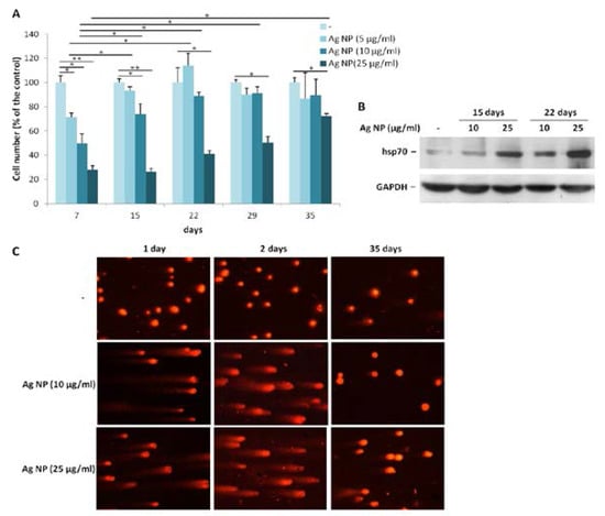 Saos-2 adapt to long term exposure to Ag NP. (A) Saos-2 cells were treated with Ag NP (5, 10, and 25 µg/mL). On the day in which the untreated control (-) became confluent, all the cells were counted and re-seeded at the same density. Data are expressed as the percentage relative to seven days-untreated cells. Data represent the means ± SD of three separate experiments in triplicate (* p < 0.05, ** p < 0.01); (B) Saos-2 were exposed to Ag NP (10 and 25 μg/mL) for 15 and 22 days. Western blot was performed using anti-hsp70 antibodies. GAPDH was used as a control of sample loading. (-: untreated cells); (C) Saos-2 were treated with Ag NP (10 and 25 μg/mL) for 1, 2, and 35 days. Comet assay was performed after staining with ethidium bromide and analyzed with a fluorescence microscope. (-: untreated cells).