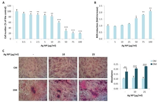 We extended our studies to hMSC, which possess the potential to differentiate into different cell types among which osteoblasts. We investigated the effects of various concentration of Ag NP. As demonstrated for Saos-2, Ag NP-induced cytotoxicity is dose dependent (Figure 3A). Similarly to Saos-2, the IC50 is around 25 µg/mL. We then analyzed ROS induction after Ag NP treatment and observed a statistically significant increase of ROS production only at high NP concentrations (50, 75, and 100 µg/mL) (Figure 3B).