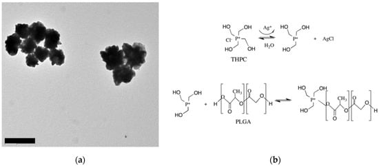 (a) TEM image of heteromer PLGA-THPC star-shaped nanoparticles (scale bar = 500 nm); (b) A hypothesized mechanism of PLGA-THPC nanostar assembly.