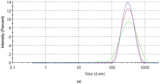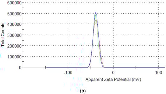 (a) Size distribution of PLGA-THPC nanostars; (b) surface charges by dynamic light scattering in water (pH 6.8). The three colored (blue, red, and green) curves represent the reproducibility in nanostar size and surface charges, as synthesized from three separate batches.