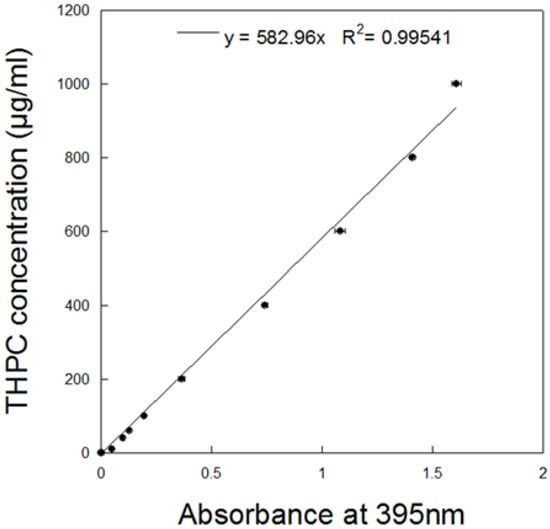 A standard curve was generated by plotting absorbance values versus various concentrations of THPC for measuring THPC concentrations in nanostars. Given the chemical structure of THPC, the chloride ion on THPC is highly reactive with the silver ion in silver nitrate (). This reaction was utilized to generate the THPC standard curve for measuring its soluble concentrations. Briefly, equal parts of THPC and silver nitrate () were mixed in a 96-well plate (Corning, Corning, NY, USA) at different concentrations. The formation of silver chloride () precipitates was detected by measuring the absorbance at 395 nm using a microplate reader (BioTek Synergy 2, BioTek, Winooski, VT, USA). Water was used as a blank.