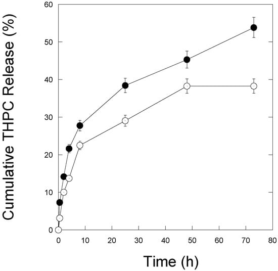 The cumulative release amount of THPC from PLGA-THPC nanostars at pH 6.2 (solid filled circles) and pH 7.4 (open circles) as determined by the silver chloride precipitation and absorbance (A395) assay. The complete release profile assay was conducted in a 37 °C water bath. The release rate is faster in breast cancer cells mimicking pH 6.2 than the body pH at 7.4.