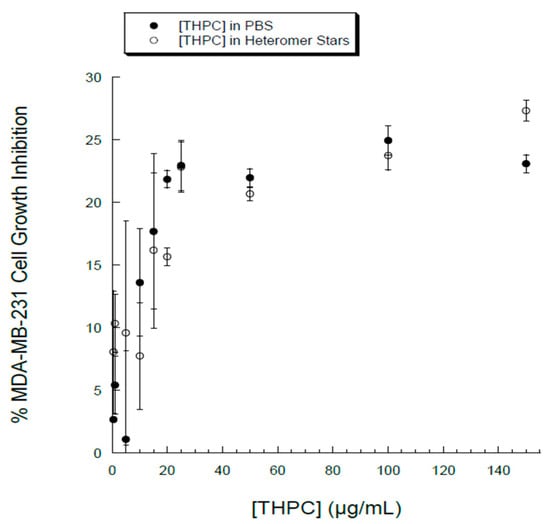 Cytotoxicity of PLGA-THPC nanostars (filled circles) as measured by its dose-dependent effects on MDA-MB-231 breast cancer cell growth inhibition. THPC solution (open circles) was used as a control.
