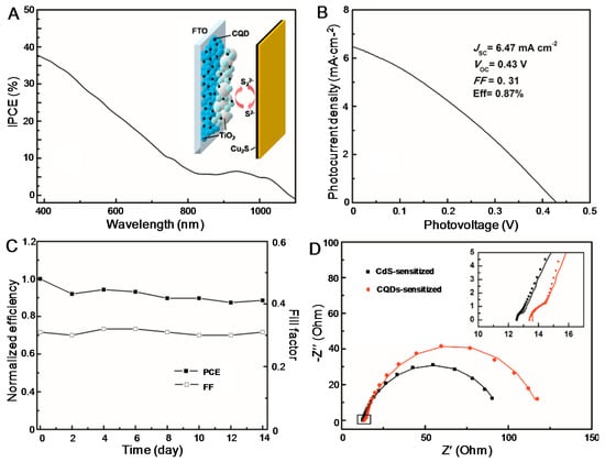 Chicago/Turabian StyleZhang, Quanxin, Geping Zhang, Xiaofeng Sun, Keyang Yin, and Hongguang Li. 2017. "Improving the Power Conversion Efficiency of Carbon Quantum Dot-Sensitized Solar Cells by Growing the Dots on a TiO2 Photoanode In Situ" Nanomaterials 7, no. 6: 130. https://doi.org/10.3390/nano7060130