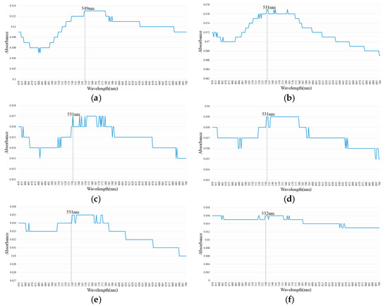 Daily ultraviolet–visible spectroscopy (UV–Vis) analysis results of nano-Au colloids fabricated at TON–TOFF values of (a) 10–10 µs; (b) 20–20 µs; (c) 30–30 µs; (d) 40–40 µs; (e) 50–50 µs; (f) 100—100 µs.