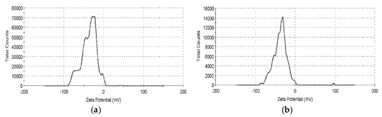 The Zeta potential was −36.6 mV for the nano-Au colloid prepared at 10–10 µs (Figure 2a) and −37.6 mV for that prepared at 50–50 µs (Figure 2b). An absolute Zeta potential value of over 30 mV indicates high suspension stability in the nanoparticles. Therefore, nano-Au colloids fabricated through m-EDM exhibited high suspension stability.