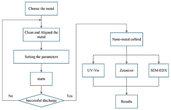 Figure 6 depicts the procedure used for the fabrication of nano-Au colloids through the ESDM. First, two selected metal electrodes are rinsed with a proper volume of DW and attached in a beaker to connect to the apparatus. Second, after fabrication parameters (e.g., TON–TOFF) are specified and the electric discharge time is adjusted according to the type of the metal, fabrication begins. Nano-Au colloids are obtained following the electric discharge. Finally, the colloids are examined through UV-Vis, a Zetasizer, and SEM–EDX [16].