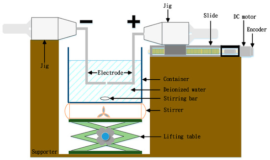 Experiment system. This horizontally structured (Figure 9) system enabled easy operation. Vertical electrodes have curved shapes that present difficulties. The system in this study used horizontal electrodes because they were more useful than vertical ones. As Figure 9 shows, the left electrode was fixed by a jig to the support stand and the right was fixed to the sliding table. Because of its sheer size, the magnetic stirrer was replaced by a magnet-equipped fan that distributed nanoparticles evenly in the DW. A lifting table was placed on the lifting platform, which was raised during fabrication and lowered after fabrication. The support stand was designed exclusively for the lift platform. The two electrodes were attached to a pulse-wave power supply to discharge electricity and produce nano-Au particles, which were collected in the vessel. Powered by a DC motor, the right electrode moved up or down the sliding track (shown on the right side of Figure 9); the position of the electrode on the track was identified by an optical encoder.