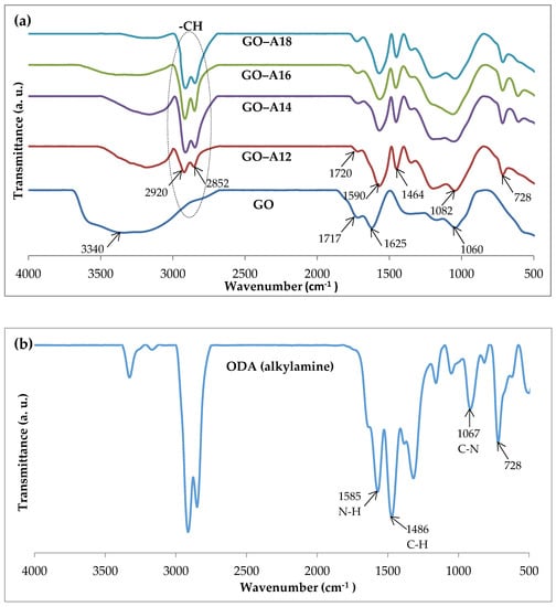 FTIR spectra of (a) GO and functionalized GO; and (b) octadecylamine (ODA).